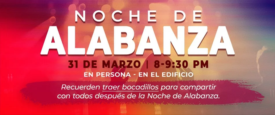 Noche de Alabanza Friday, March 31, 2023 8:00 PM 9:30 PM 20:00 21:30 Iglesia de Cristo en Sunset 12001 Southwest 72nd Street Miami, FL, 33183 United States (map) Google Calendar ICS