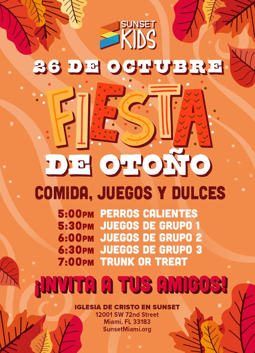 Fiesta de Otoño Sunday, October 26, 2025 5:00 PM 7:30 PM 17:00 19:30 Iglesia de Cristo en Sunset 12001 Southwest 72nd Street Miami, FL, 33183 United States (map) Google Calendar ICS