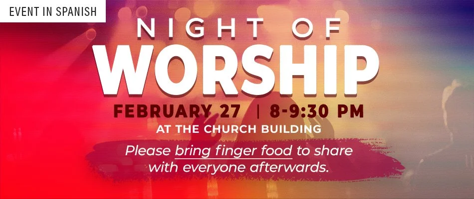 We invite you to join us for a night of worship and prayer at the church building. This event is in Spanish. Please bring finger food to share with everyone afterwards.