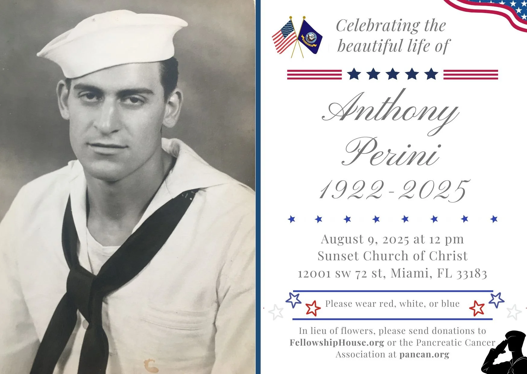 Celebration of Life: Tony Perini Saturday, August 9, 2025 12:00 PM 2:00 PM 12:00 14:00 Sunset Church of Christ 12001 SW 72nd Street Miami, FL 33183 (map) Google Calendar ICS View fullsize A Celebration of Life service for Tony Perini, will be held on Saturday, August 9, at 12pm at Sunset Church of Christ. Fellowship to follow. Livestream will be available and hosted on Sunset’s YouTube page for those who cannot attend. Sunset’s YouTube Page